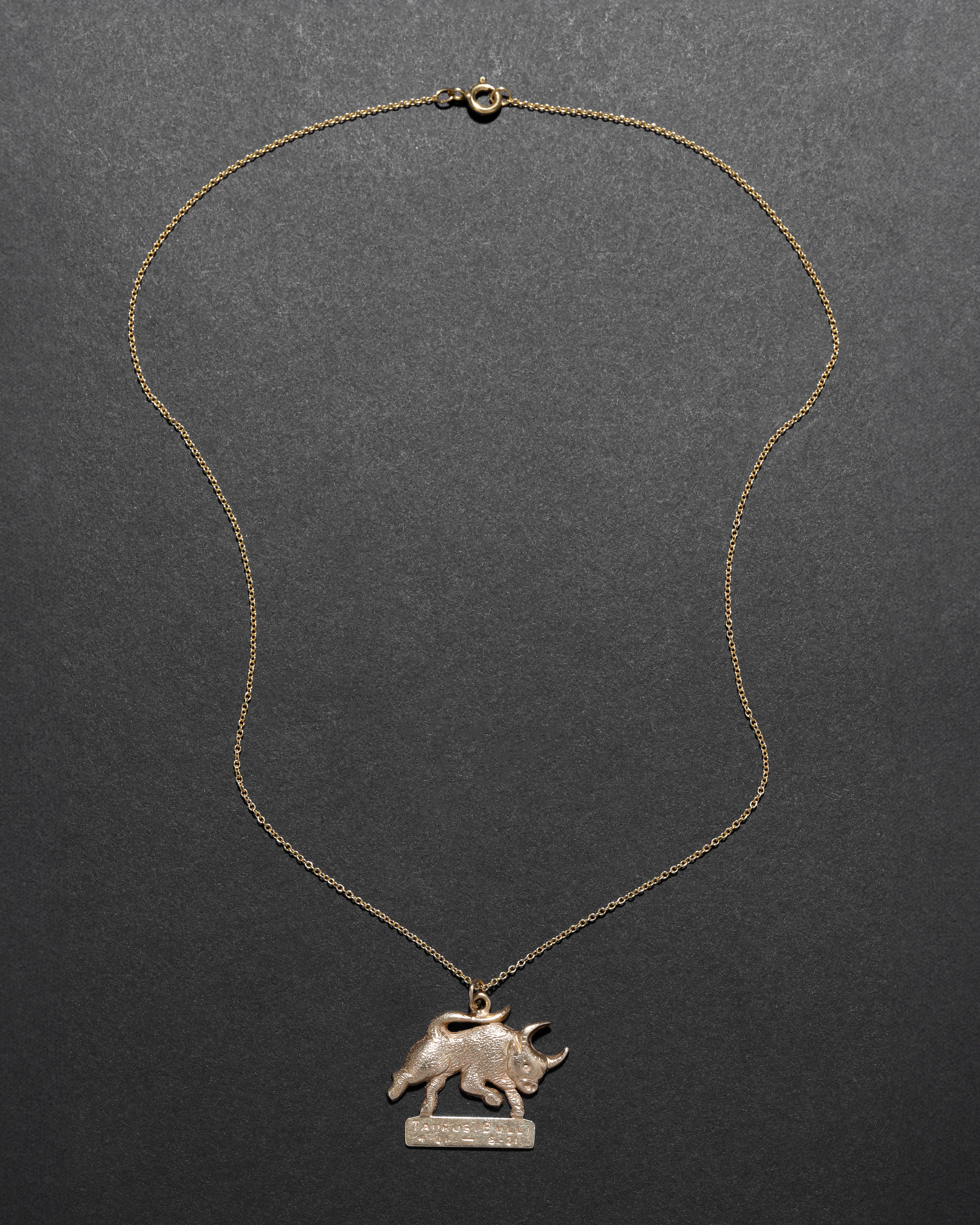 Representing the zodiac sign Taurus, this 14k gold bull pendant from the Bohemian 1970s has hand-etched details and "Taurus Bull 4.21 - 5.21" inscribed onto the base.