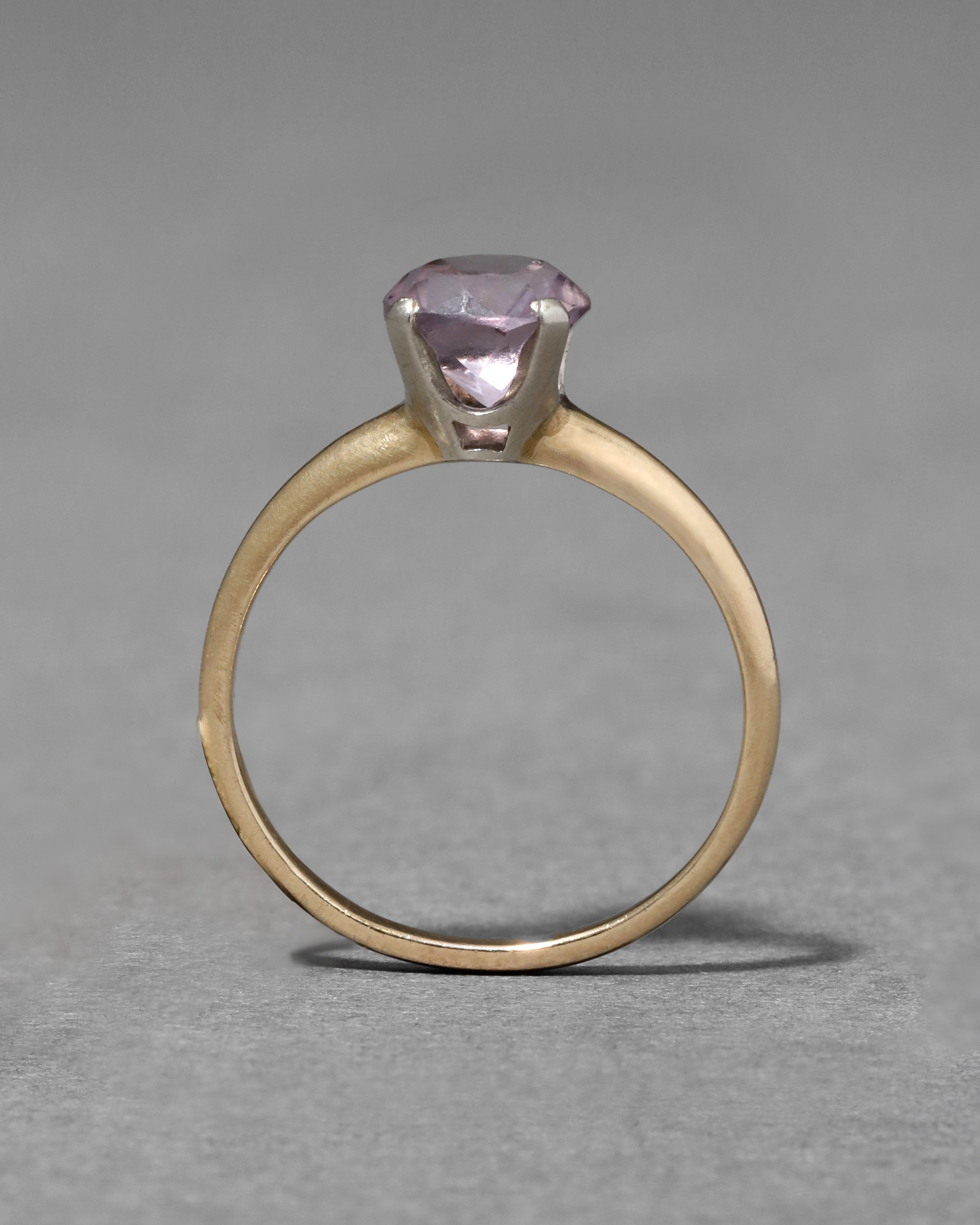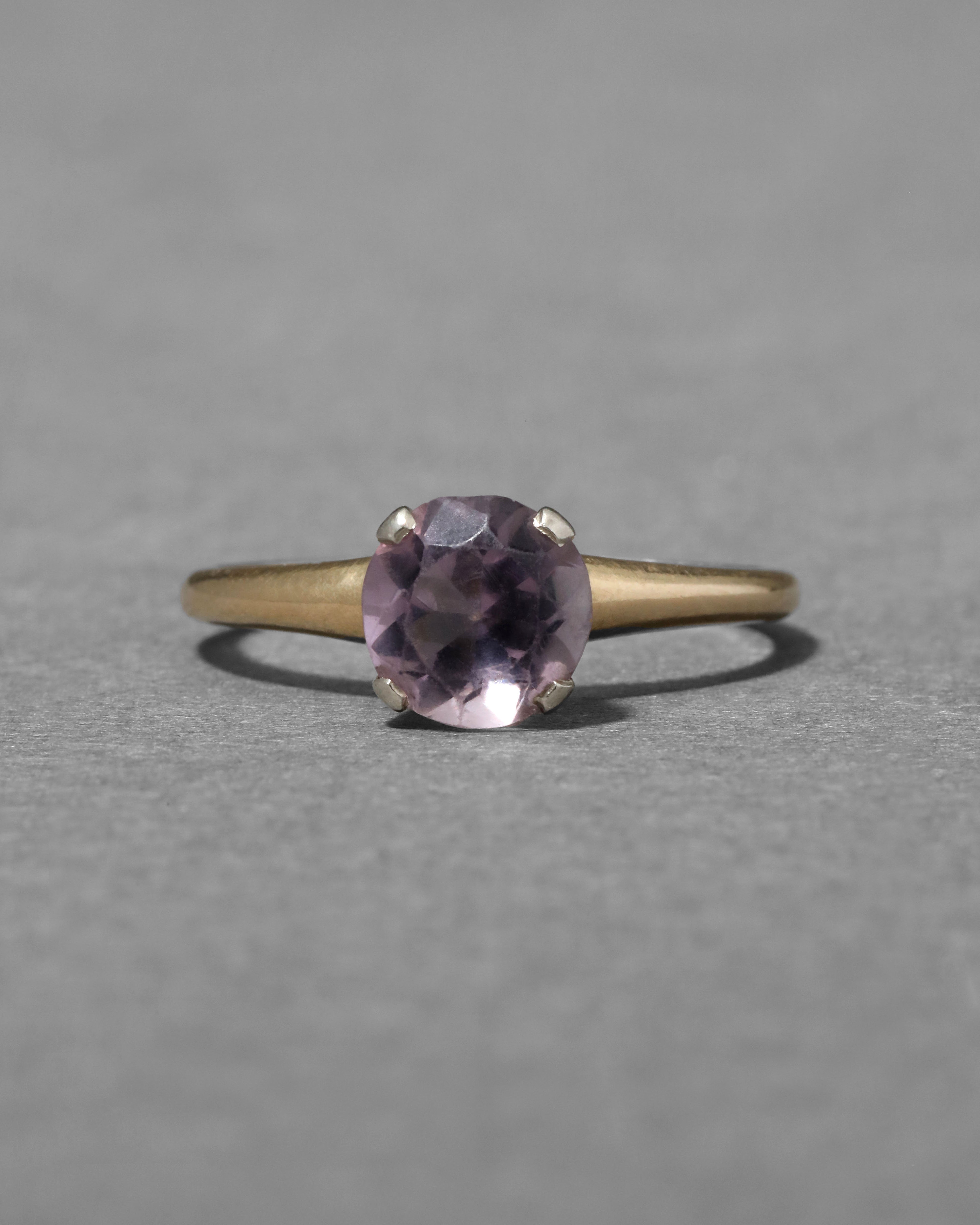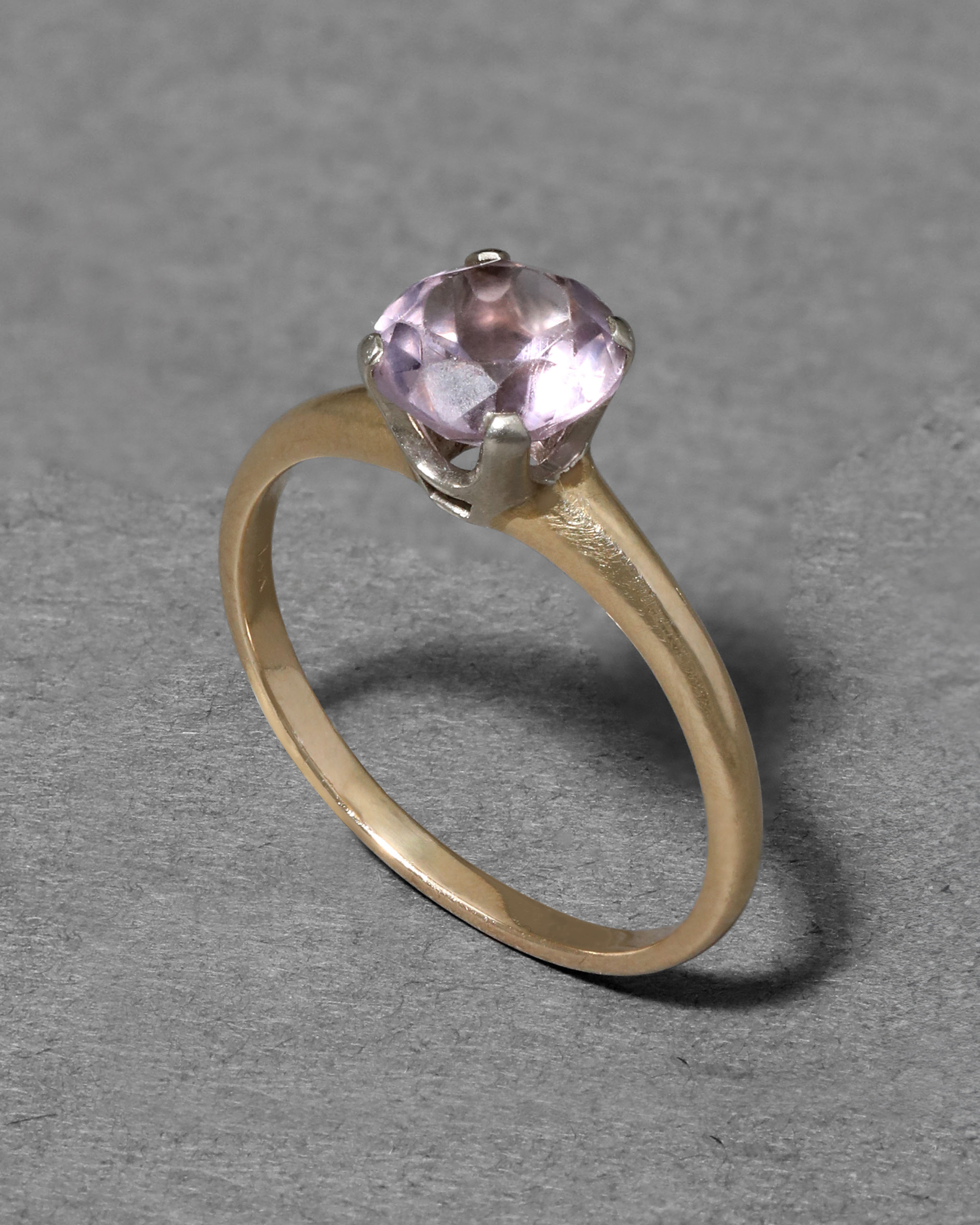 A glistening amethyst solitaire is prong set in 14k white gold, on this 14k yellow gold band ring from the 1970s.