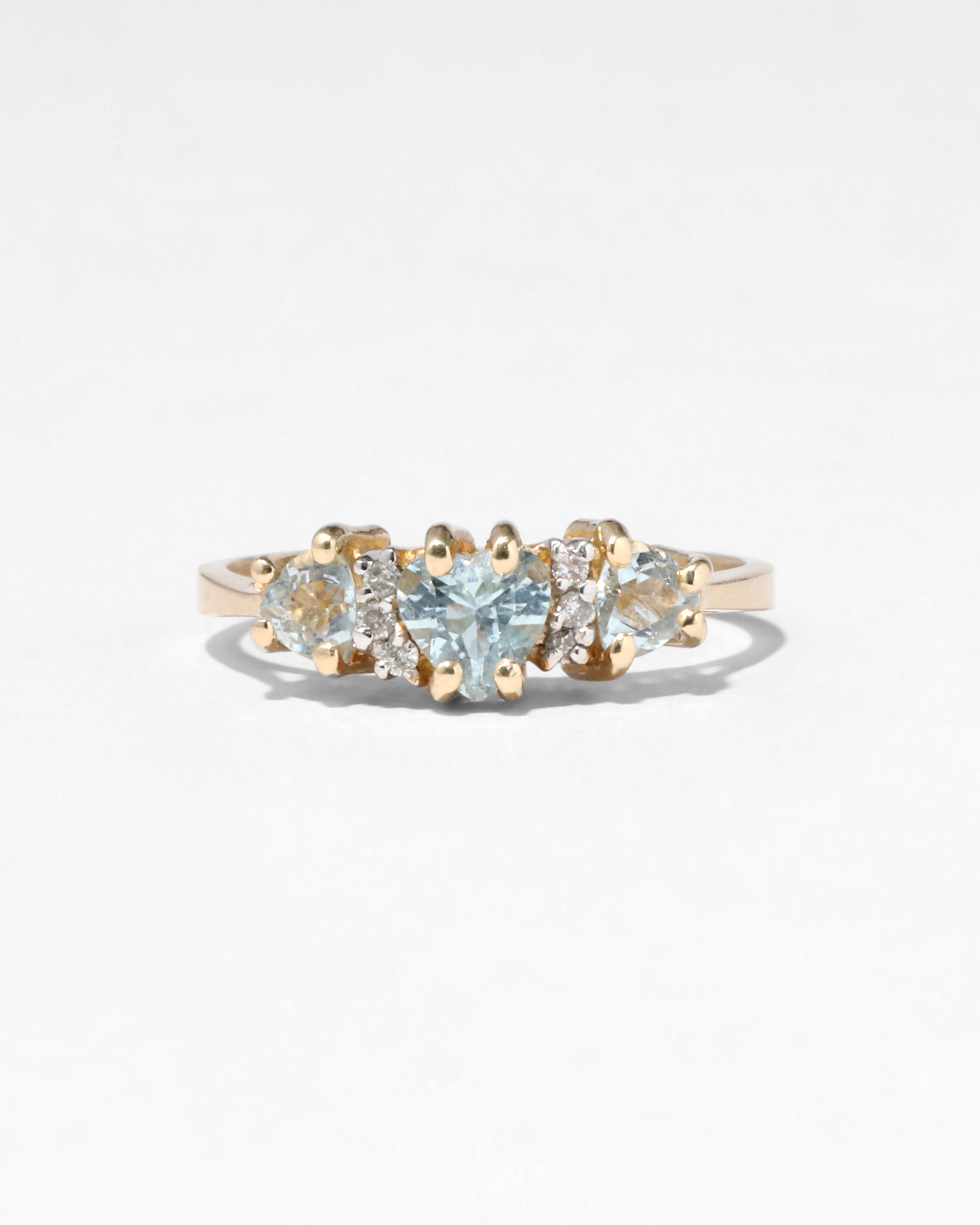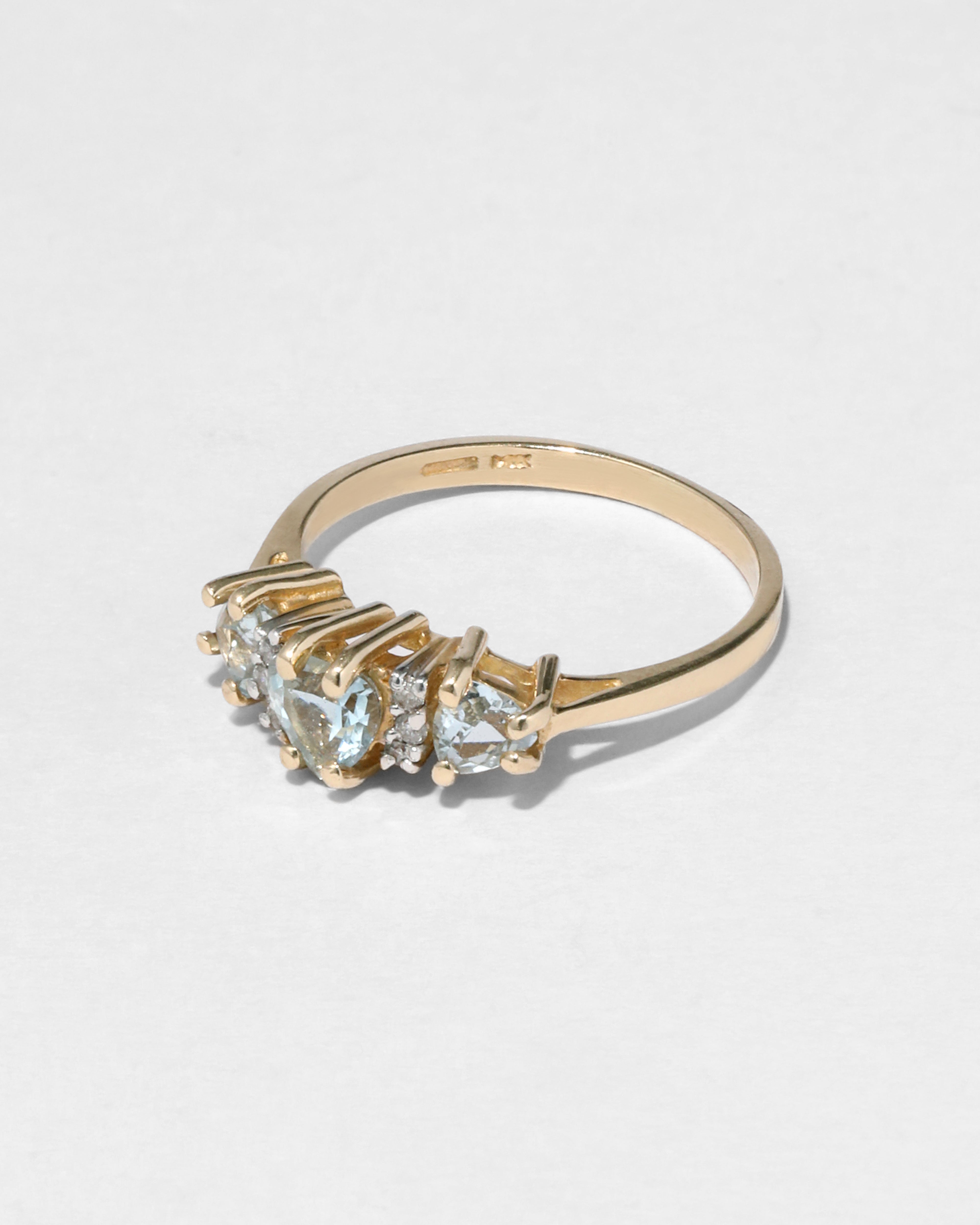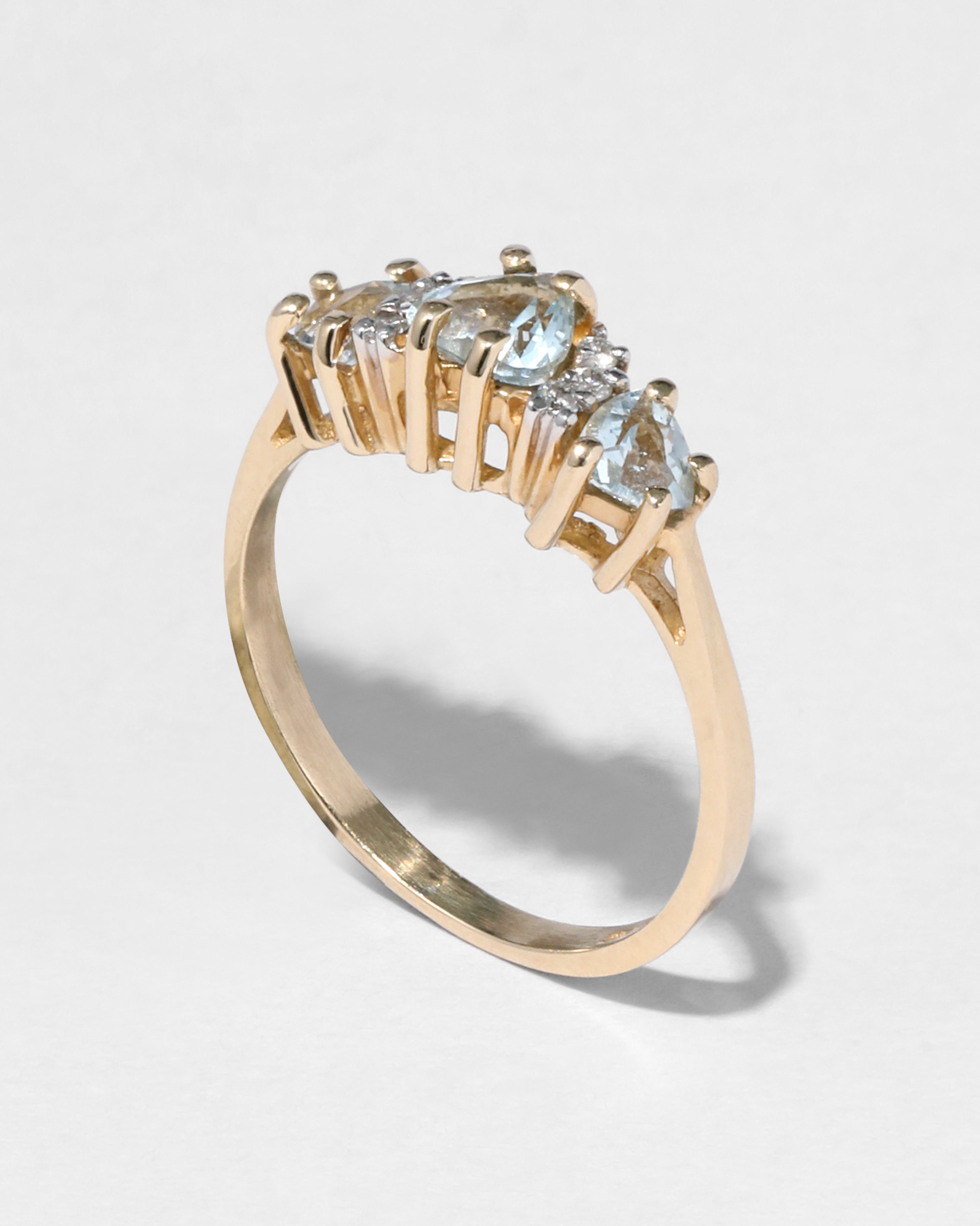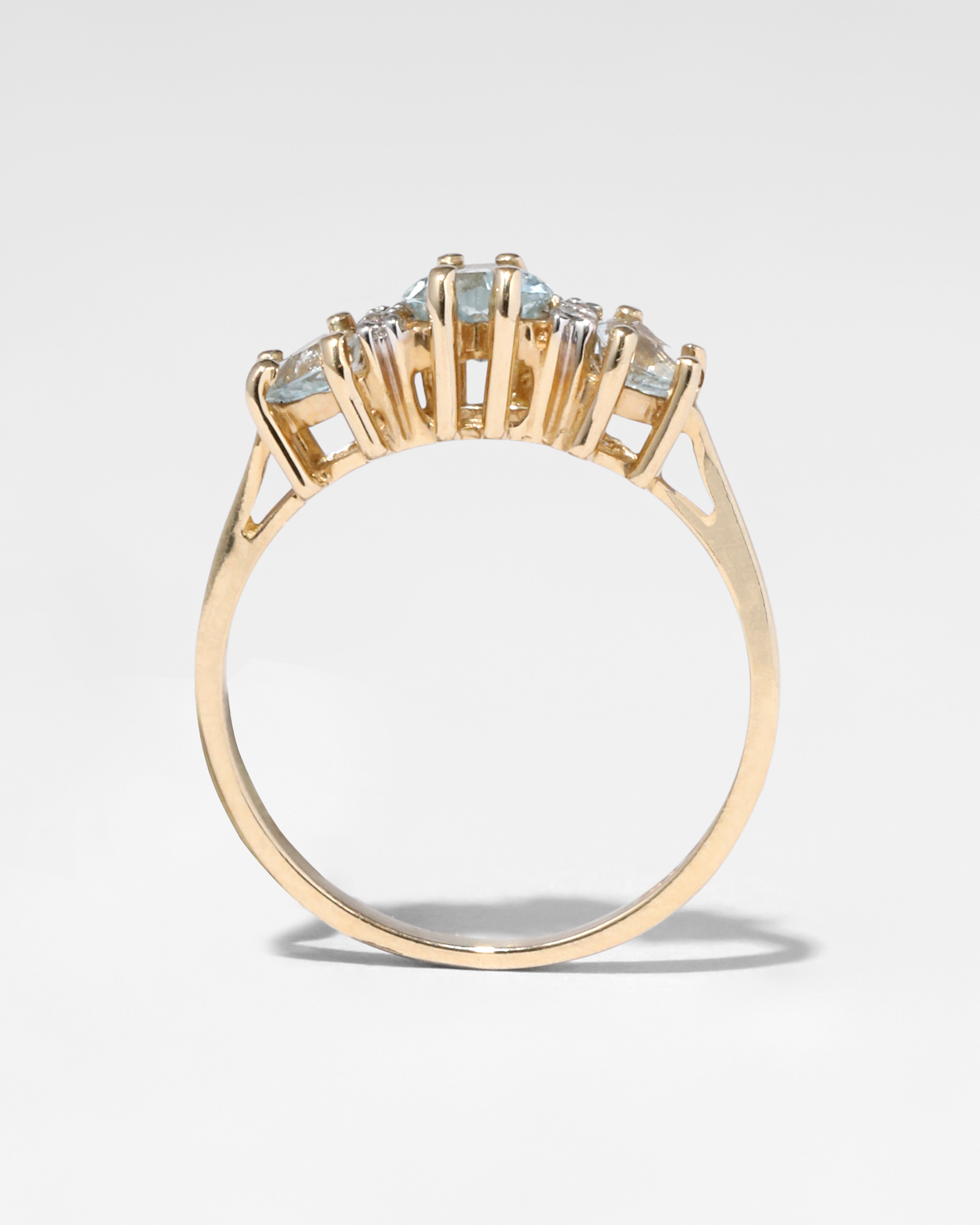 From the 1980s, this vintage ring features hand-cut graduated pear cut diamonds and aquamarine stones in classic shank settings. Finished with 14k gold open metalwork.