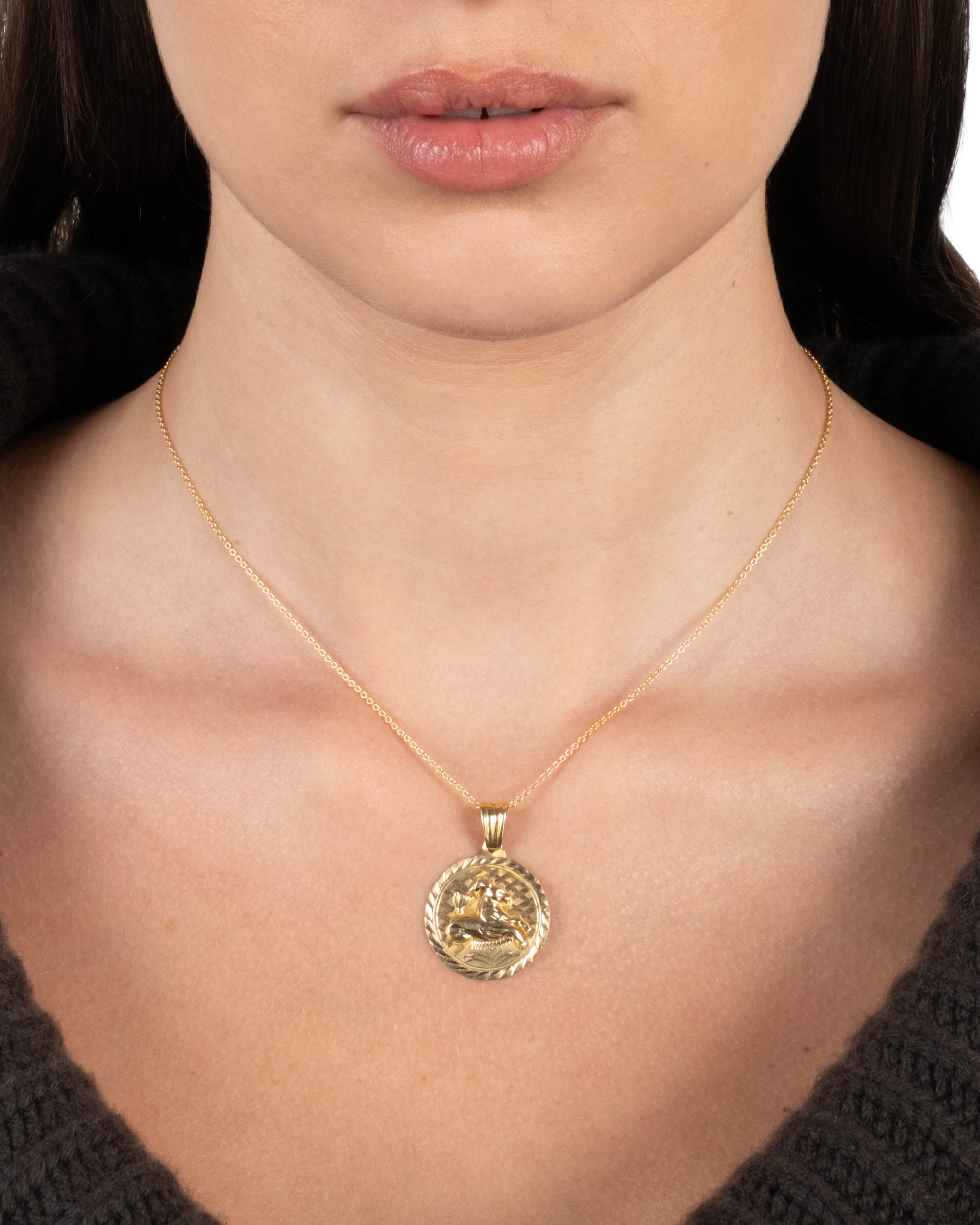 From the 1980s, this meticulously hand-crafted 14k gold pendant has a dashing capricorn sea goat surrounded by hand-etched textural motifs framed by a border of tidal waves. Strung on a 14k gold fill chain.