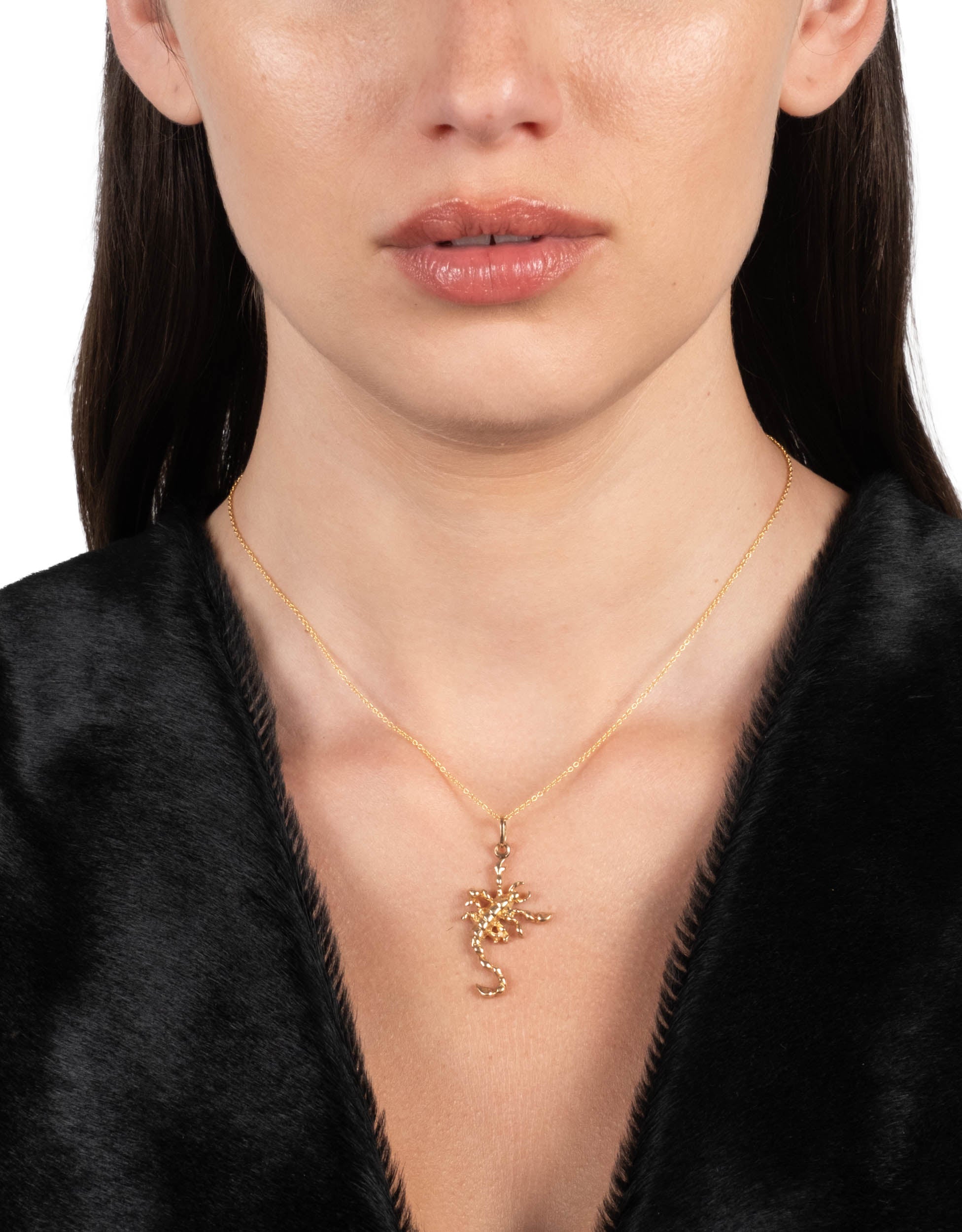Sculptural 14k gold scorpion pendant from the 1980s with a highly detailed silhouette that reflects light from every angle. Strung from a 14k gold fill chain and perfect for a Scorpio, or worn as a symbol of protection & transformation.