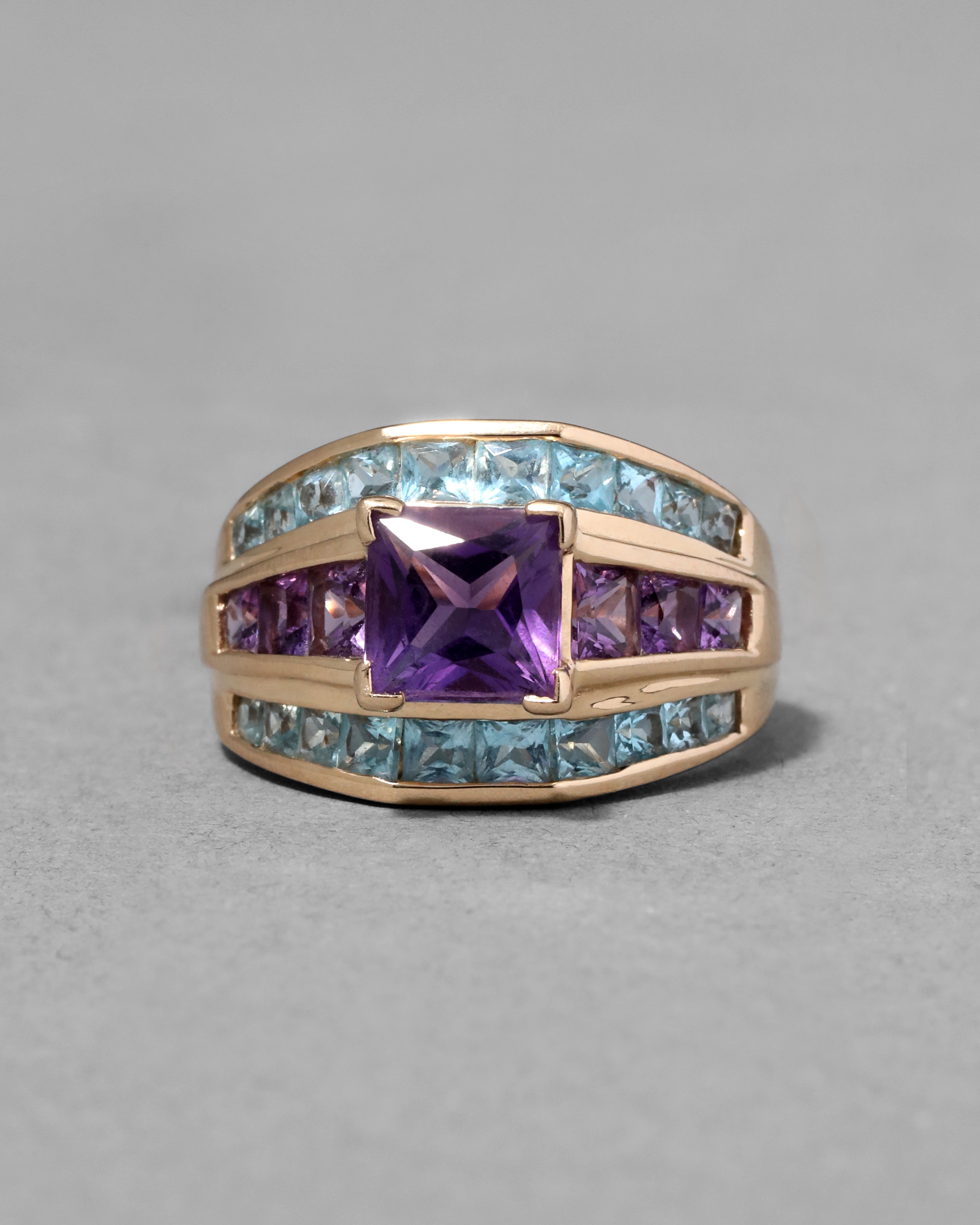 This vibrant 14k gold cocktail ring from the 1980s showcases rows of vivid glistening blue topaz and amethysts, all channel set, & extending from a large prong set amethyst center.