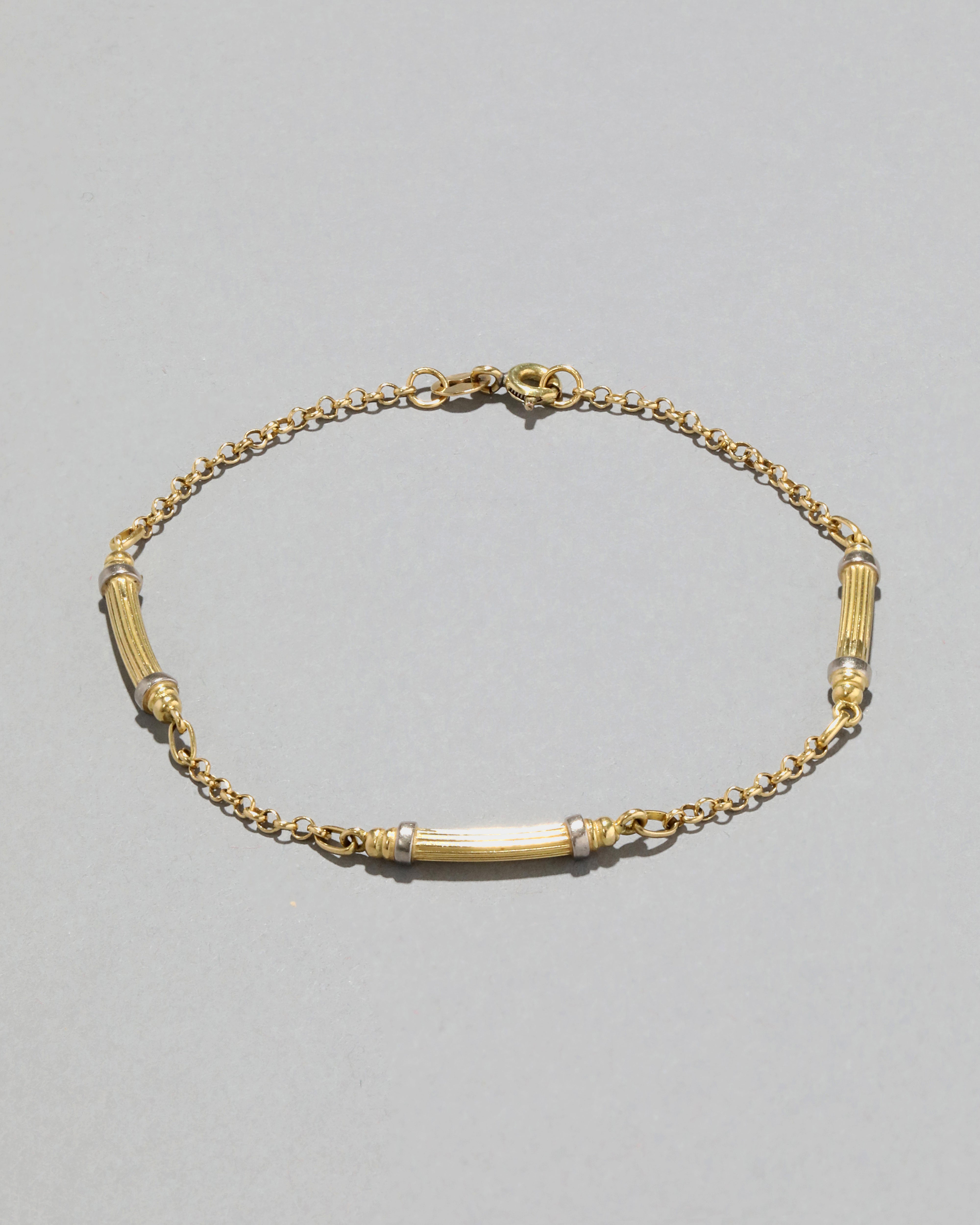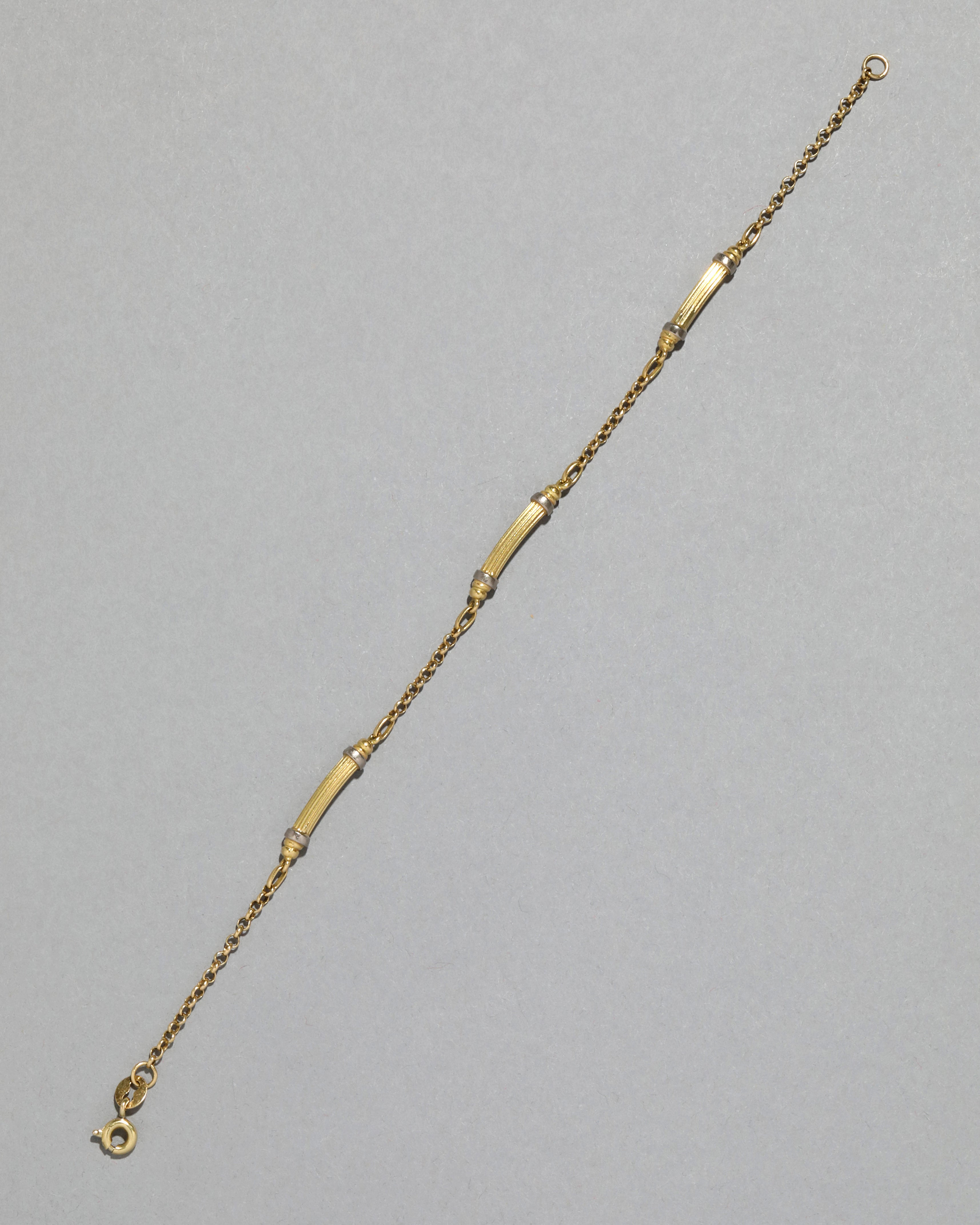 From the 1980s, this chic two-tone station bracelet is composed of 18k yellow gold ribbed segments accented with 18k white gold. Linked together for a truly timeless yet unique heirloom bracelet.