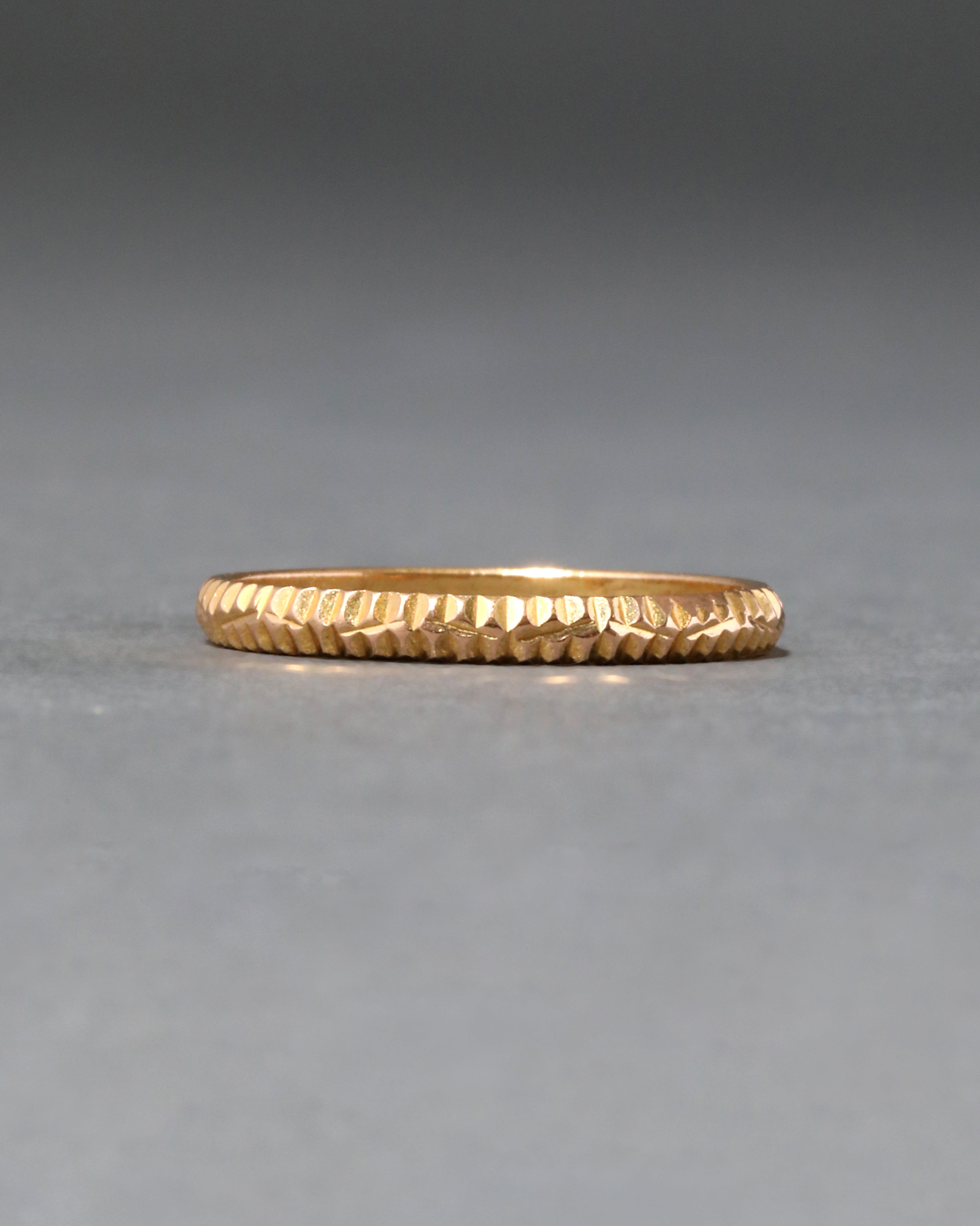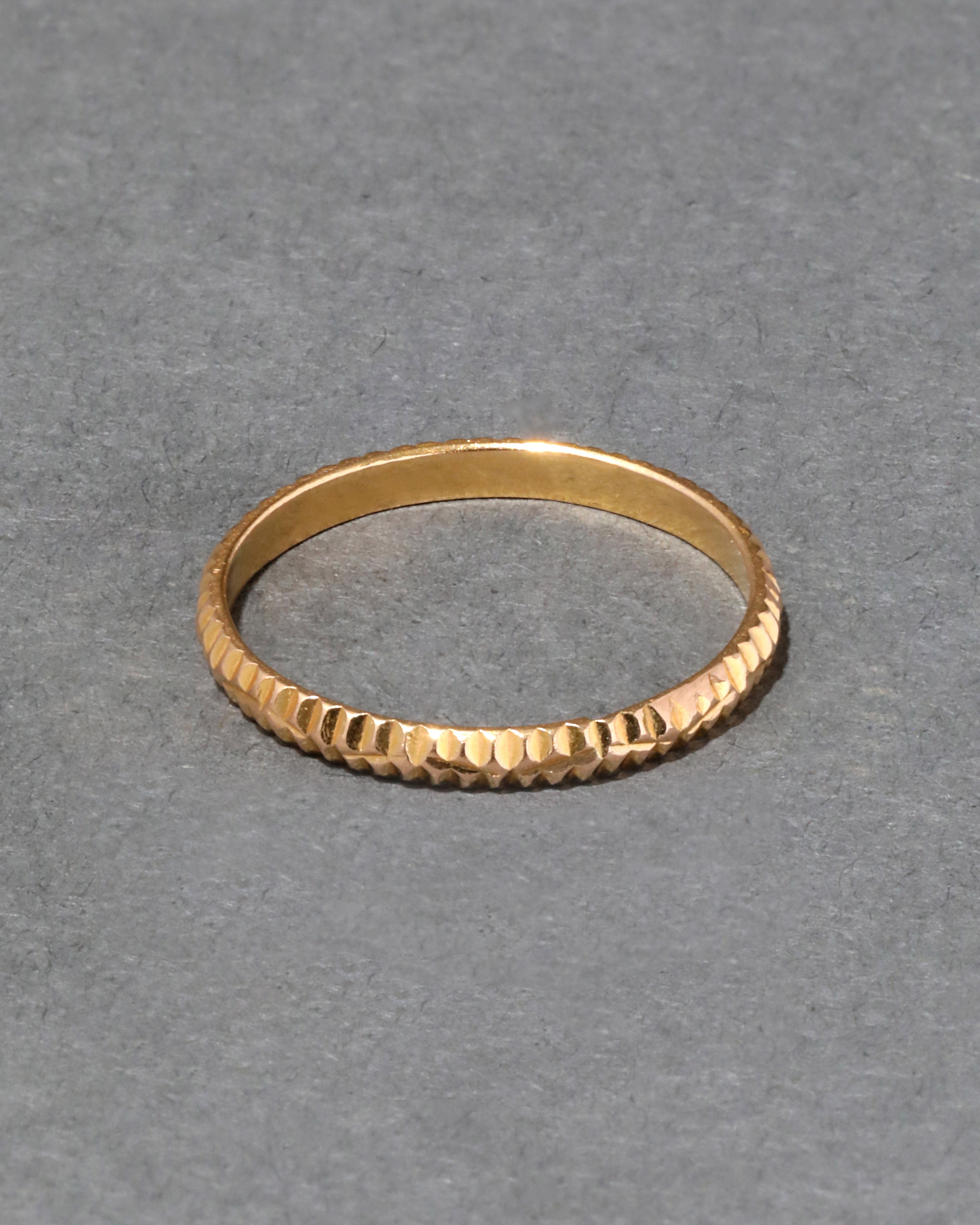 21k gold band from the 1980s with a hand-faceted textured silhouette that reflects light with a radiant glow.