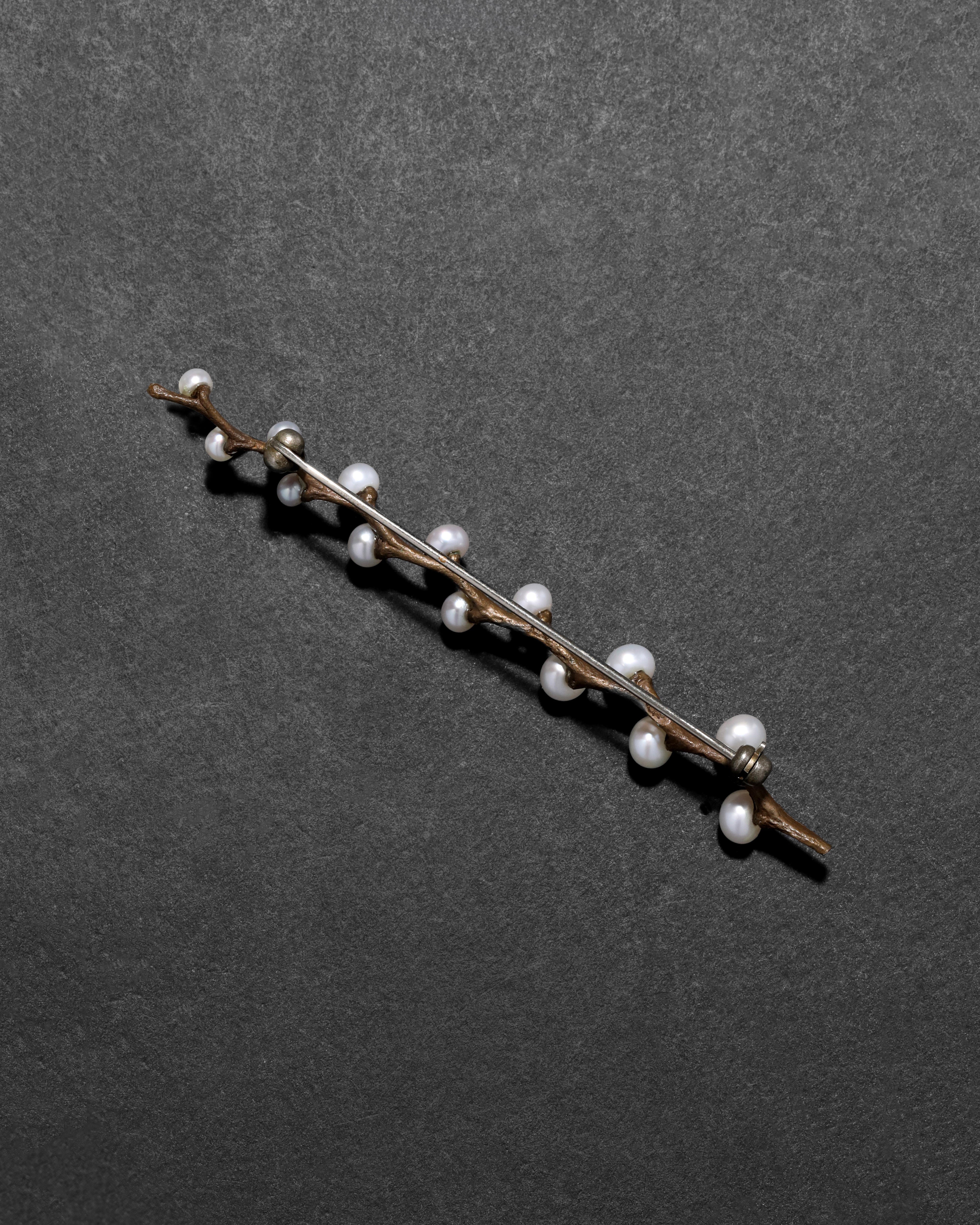 Gorgeous handmade bronze pin with a Minimalist silhouette of a branch, accented with beautiful cultural pearls.