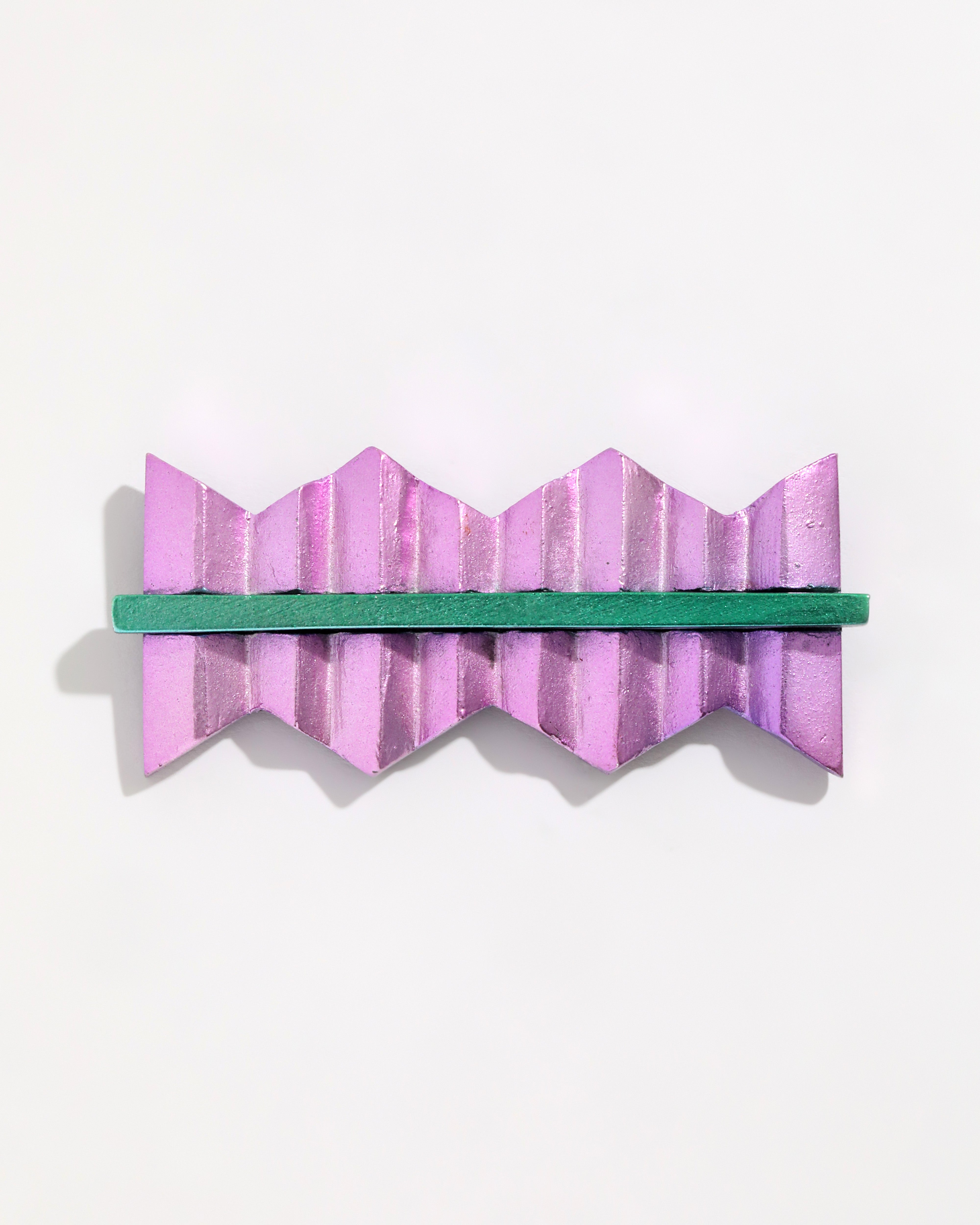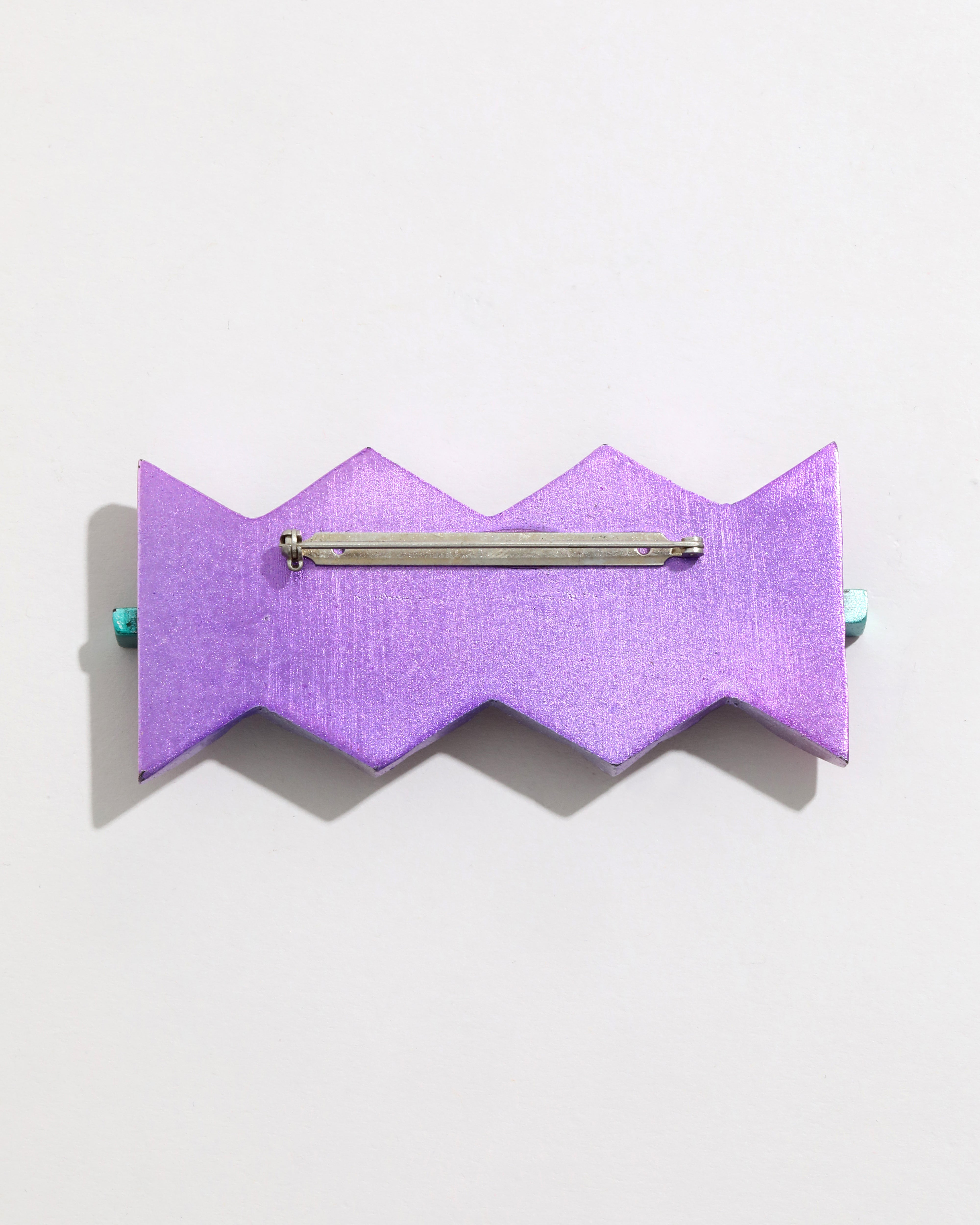From the 1980s and inspired by the Memphis Design art movement, this vintage pin features punchy purple and green metallic wood in a cool zig zag design.
