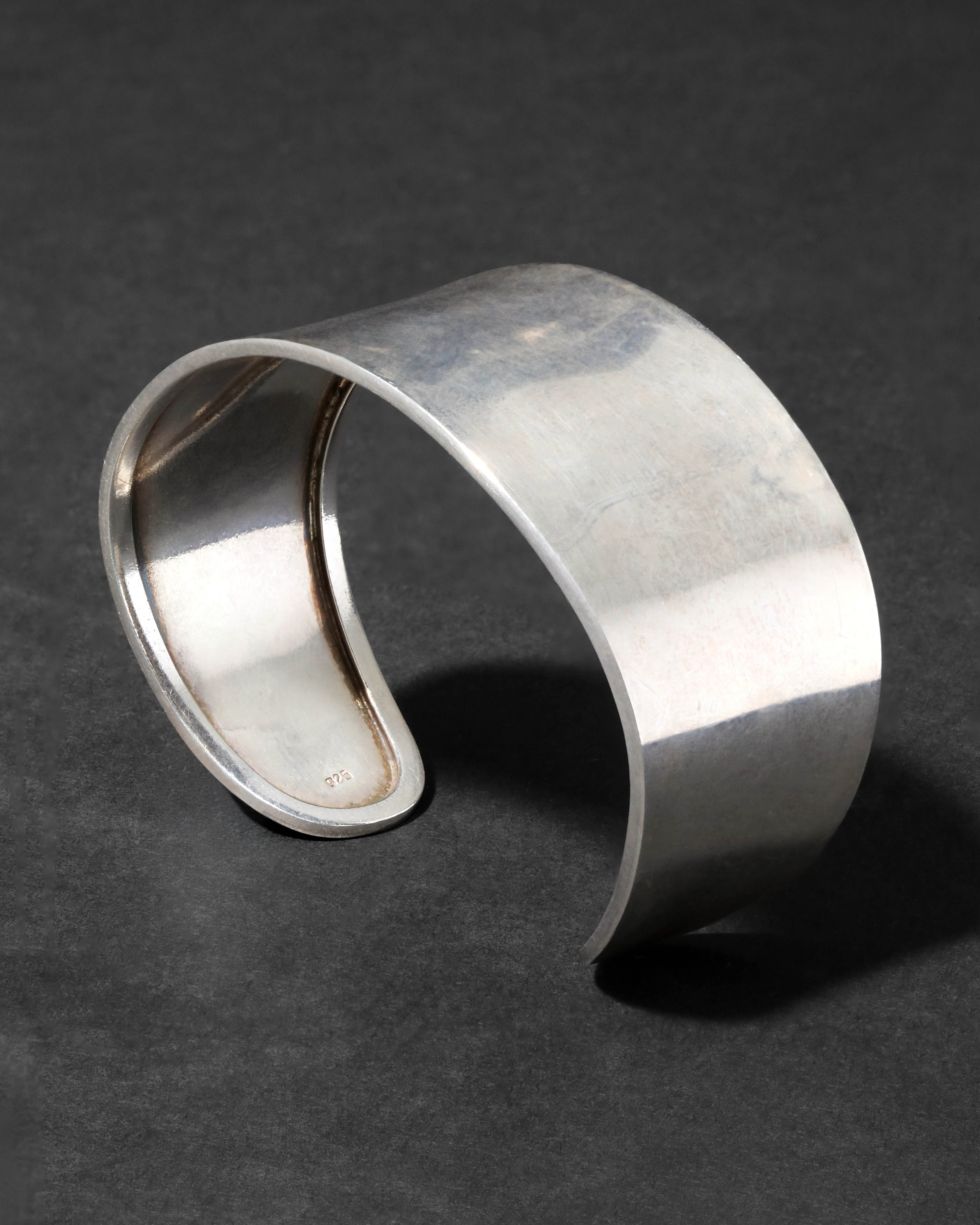 Lustrous sterling silver cuff from the 1980s, with a chic minimalist high-shine silhouette that drapes the wrist like sculptural fabric.