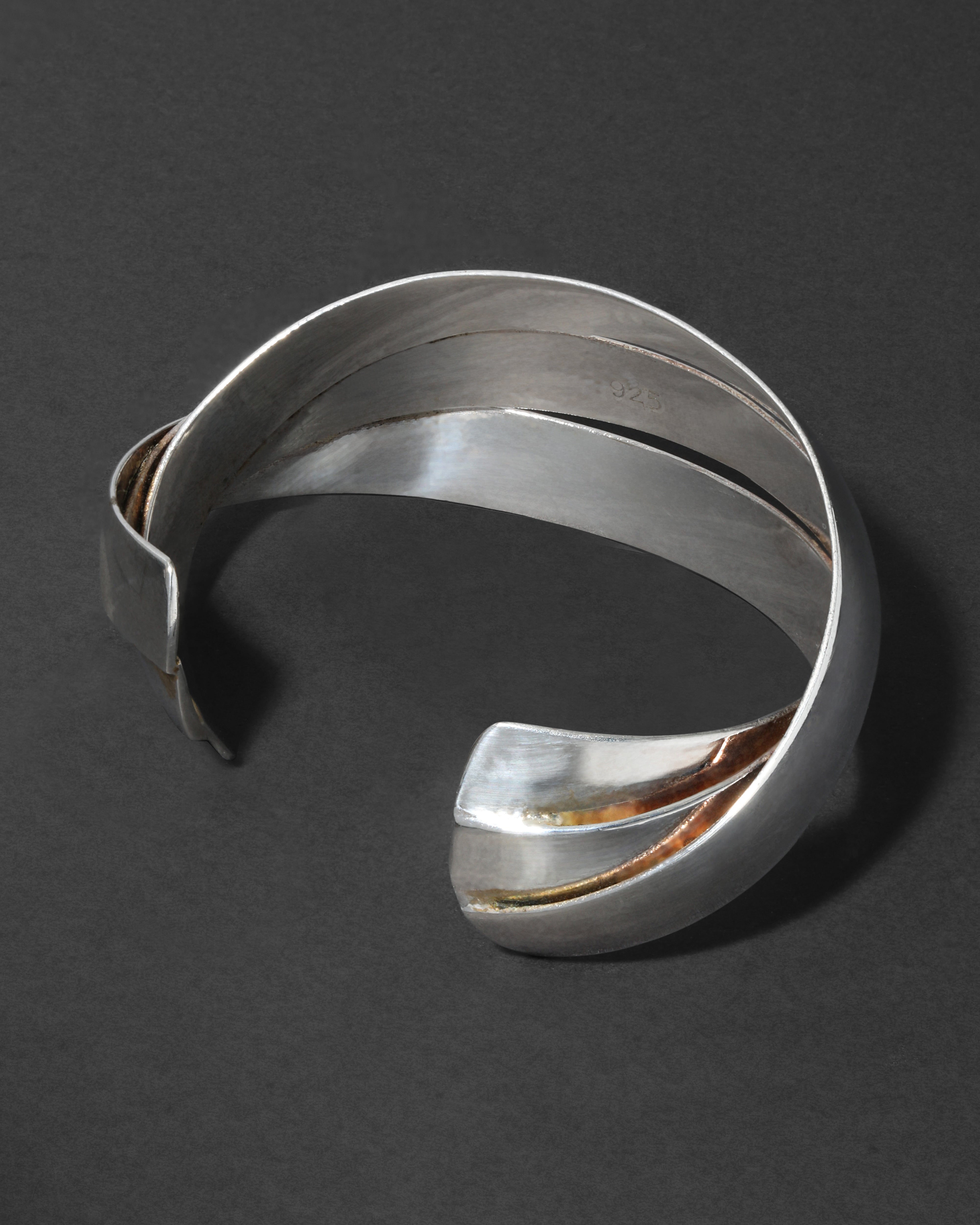 With overlapping ribbon metalwork, this handmade sterling silver cuff bracelet from the 1980s has a bold high-shine orbiting silhouette.