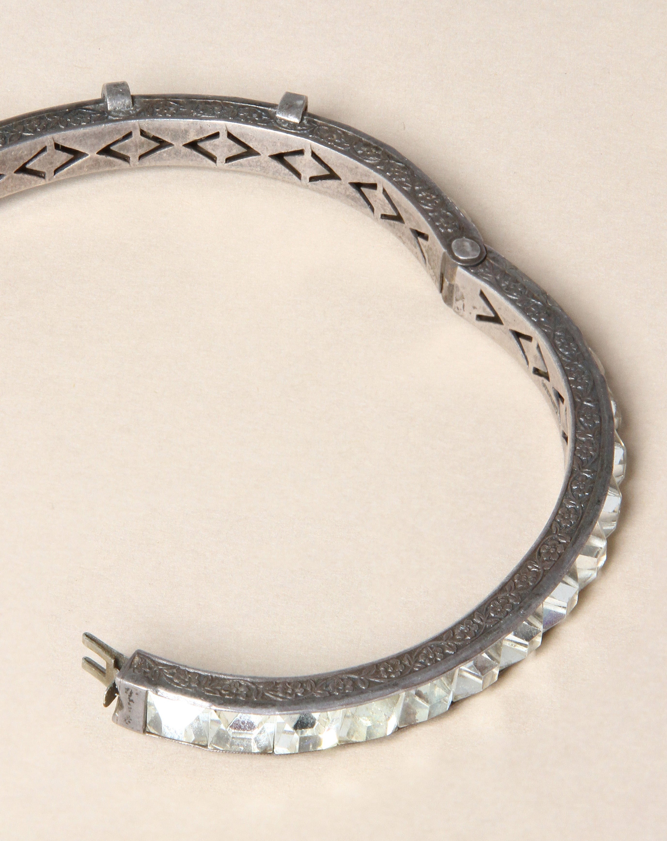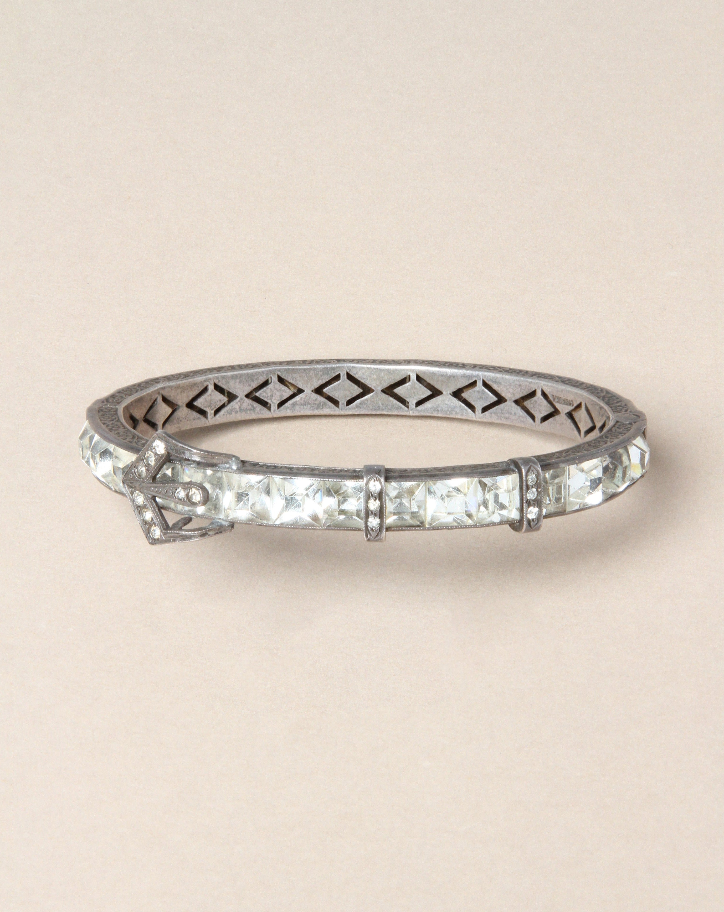 From the 1930s-40s, this vintage Art Deco hinged bracelet features a classic buckle motif set with sparkling paste stones in sterling silver.