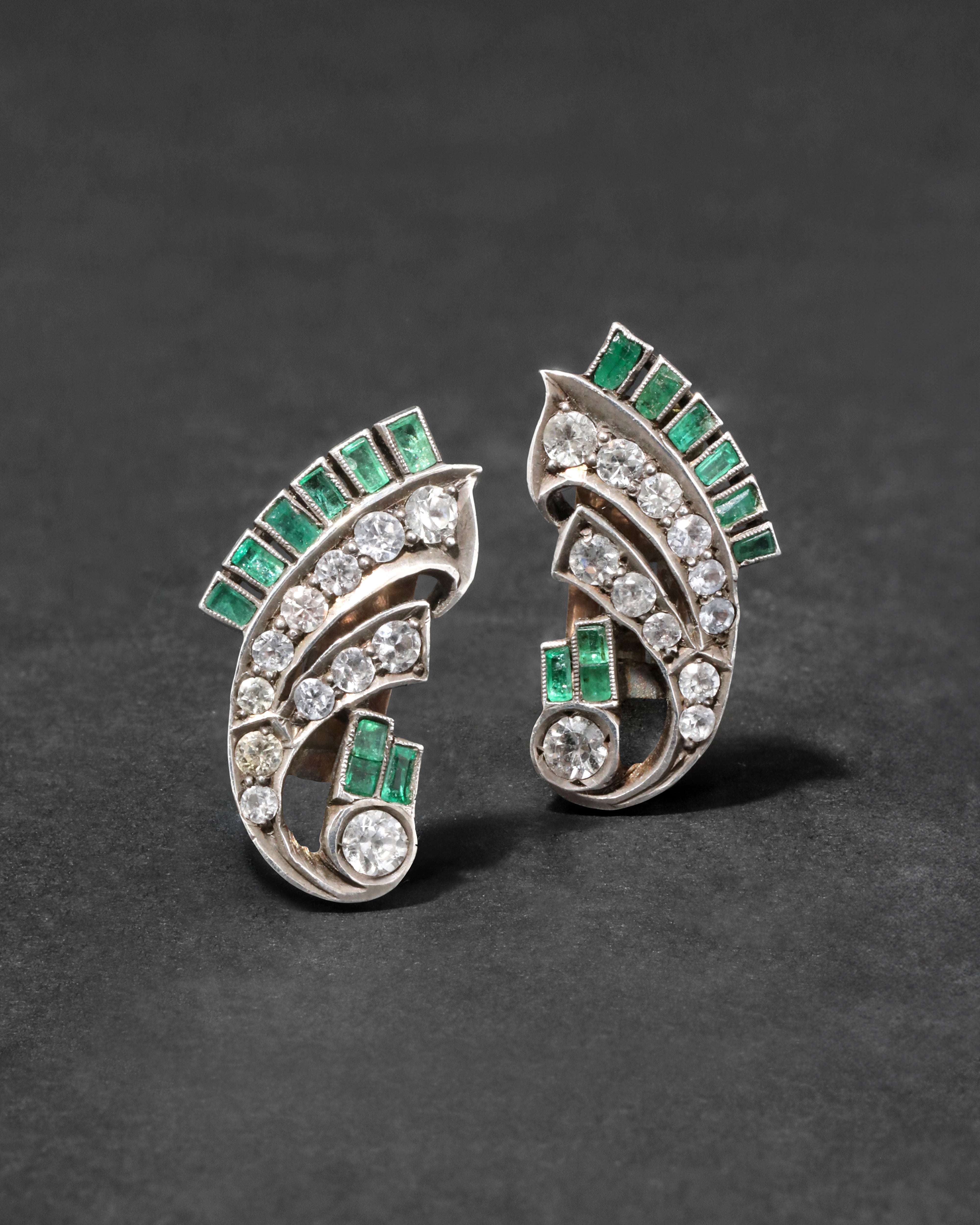 Vintage 1930s Art Deco sterling silver duette pin that converts to a pair of clip on earrings, accented with glistening diamonds and square cut emeralds.