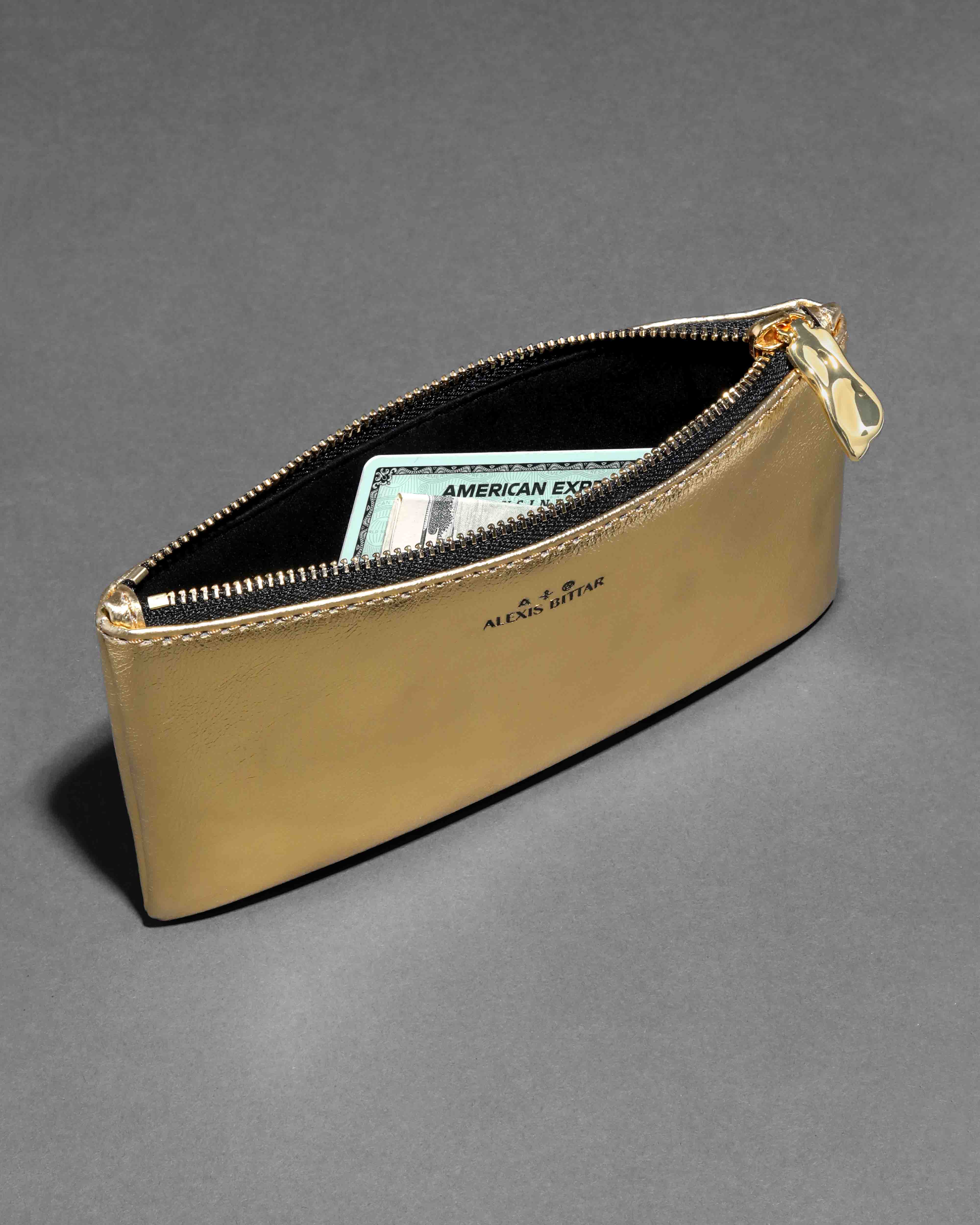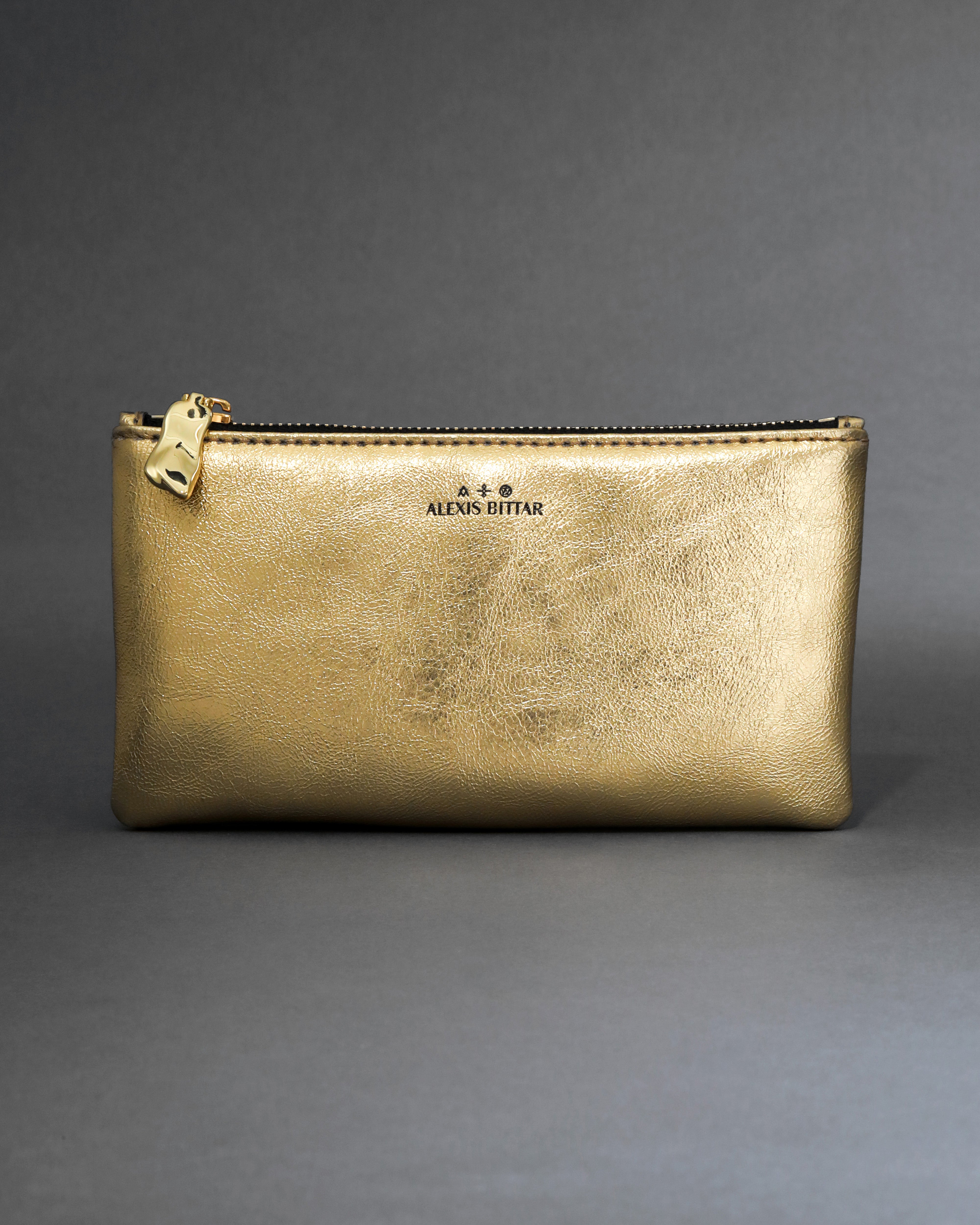 Crafted in split genuine leather with a hand-crafted metallic gold foil finish. This versatile zippered pouch is perfect for stashing small items and features Alexis Bittar signature 14k gold plated hardware.